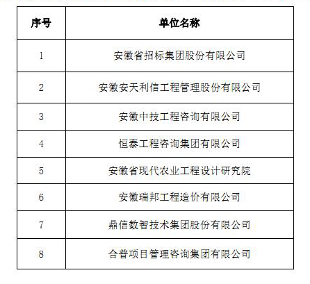 经过农垦集团公司组织评审,择优确定了8家招标代理机构进入安徽农垦招标代理机构库,现将入库名单公告如下: