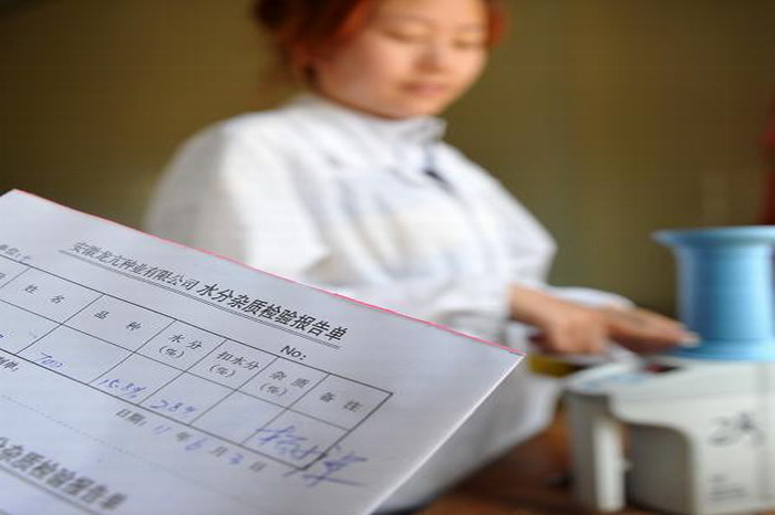 在龙亢农场良种生产厂,工作人员对送来的麦子进行质量检测。