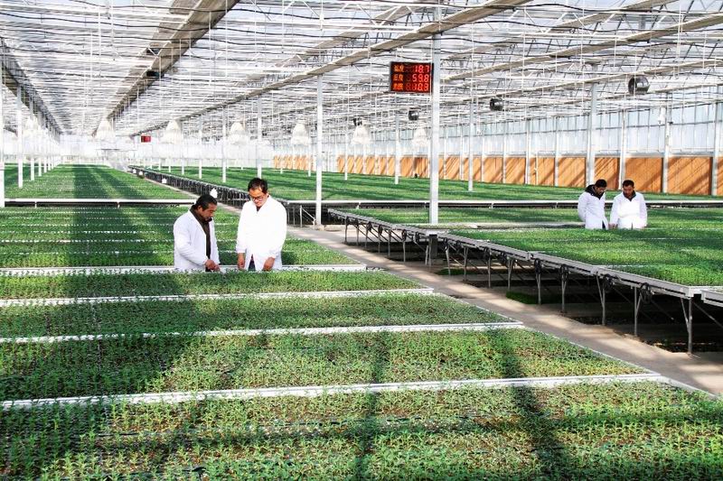 上图2.农技人员在智能温室大棚查看特种蔬菜苗长势