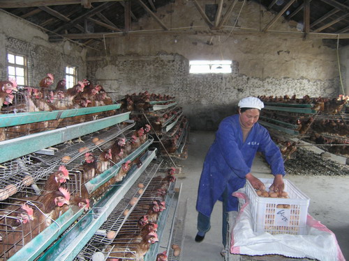 潘村湖农场一分场女职工王文梅在搞好大田生产的同时,积极发展蛋鸡养殖业取得了显著的经济效益。目前,她的养鸡场存栏蛋鸡2000只,产蛋率保持在85%以上,年纯收入数万元,成为农场职工勤劳致富的带头人。在前不久召开的该场“双先”表彰大会上,王文梅被授予发展职工自营经济先进个人称号。图为王文梅正在捡拾鸡蛋的情景。(杨登宏摄)