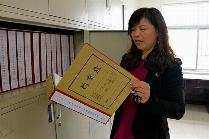 记者在王振荣简单的办公室里看到,靠墙边摆放着一台老式缝纫机,上面一台崭新的档案扎针机。办公室主任王伟指着缝纫机说,以前把档案归档前都要把档案扎好,王振荣就把自家的缝纫机抬来扎档案。现在购买的档案扎针机,她还不舍得用。