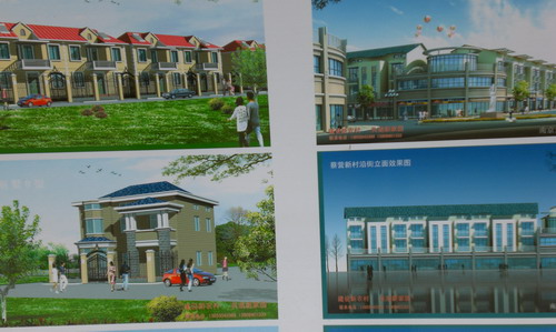 为促进新农村建设加快发展,大圹圩农场本着互惠双赢的原则,就新农村共建问题主动与地方有关部门多次沟通洽谈,并就诸多问题达成共识,:农场和新农村规划区将对交通、下水道、自来水、电力、电信、通讯等相关辅助设施实行资源共享、共同建设,农场将发挥现有资源优势,积极为新农村建设提供服务;农场职工可以到蔡营新农村小区购置房屋居住,享受蔡营村村民同等待遇。图为:蔡营村新农村规划区鸟瞰图和小区建筑模型图。