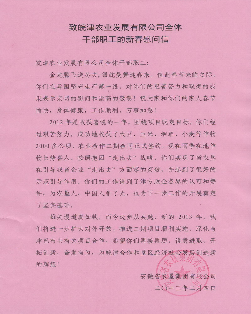 安徽农垦集团致信慰问皖津公司全体员工